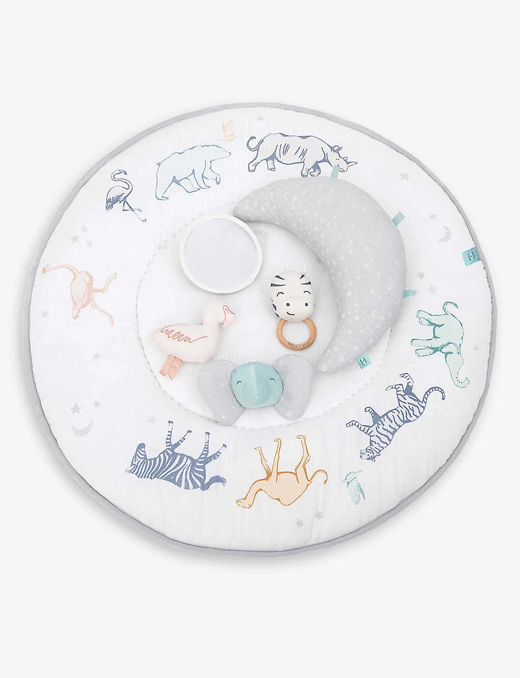 - Animal print, tummy time pillow, three attachable toys, hanging mirror