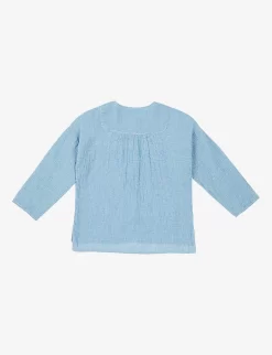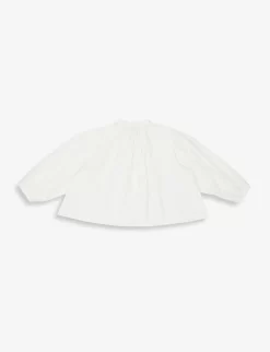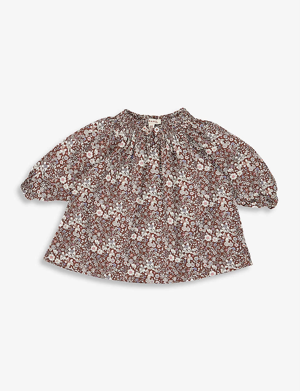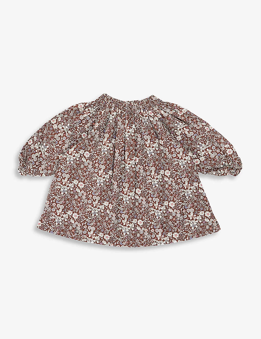 - Smocked round neck, single button, all-over floral print, elasticated ruffled cuffs, flared hem
