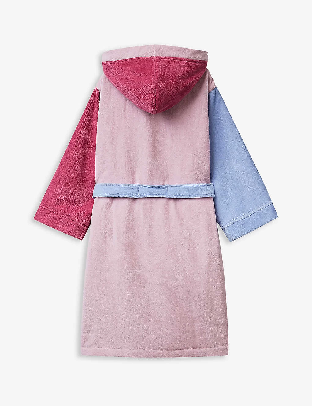 - Hooded, long sleeves, embroidered logo at chest, self-tie belt, all-over contrast block panelling, towelling fabrication