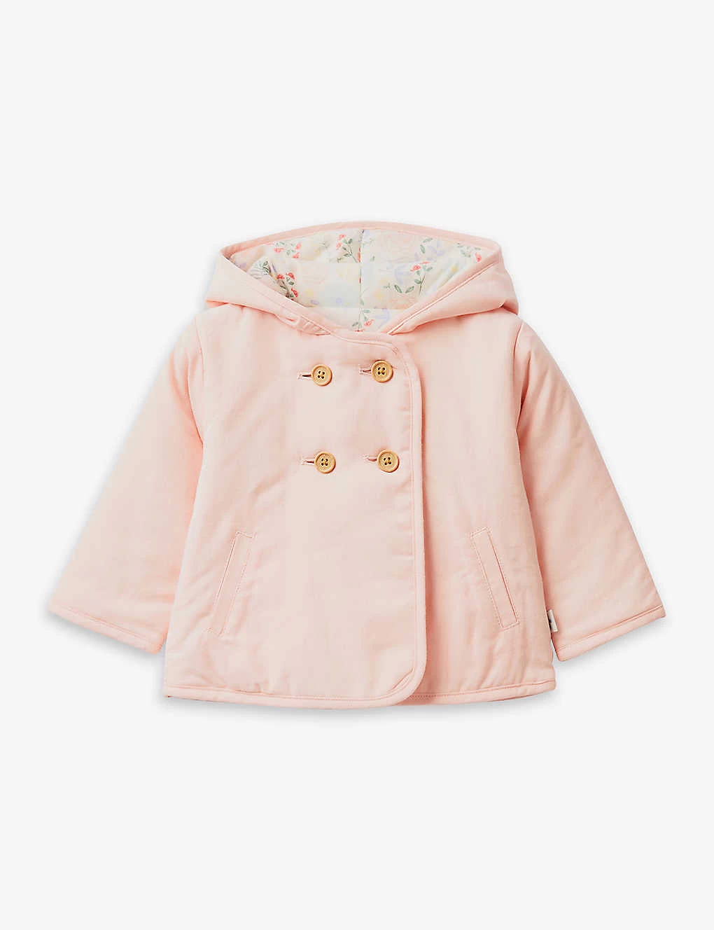 - Double breasted, hooded, long sleeves, two welt pockets at front, internal floral-print lining, all-over light padding