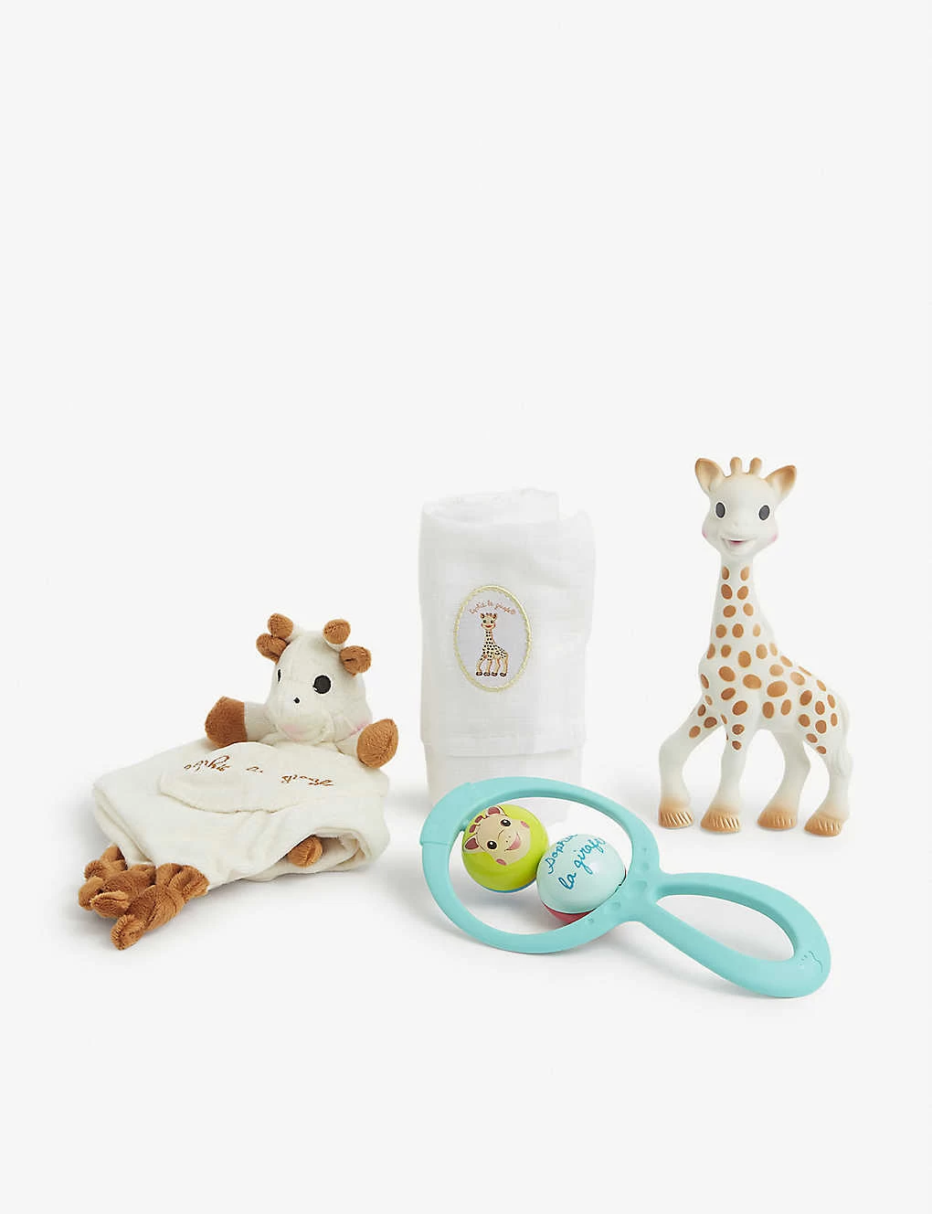- Basket with handles and giraffe print, includes signature giraffe teether, muslin with embroidered giraffe patch, rattle toy, comforter with giraffe plush at centre
