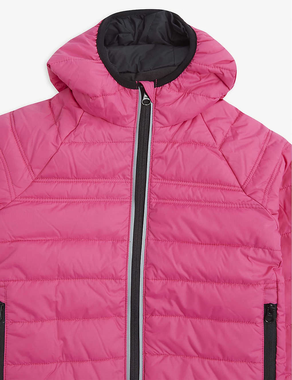 - Elasticated hood, long sleeves, twin zip pockets, all-over quilted, reflective panel at zip, embroidered logo at sleeve