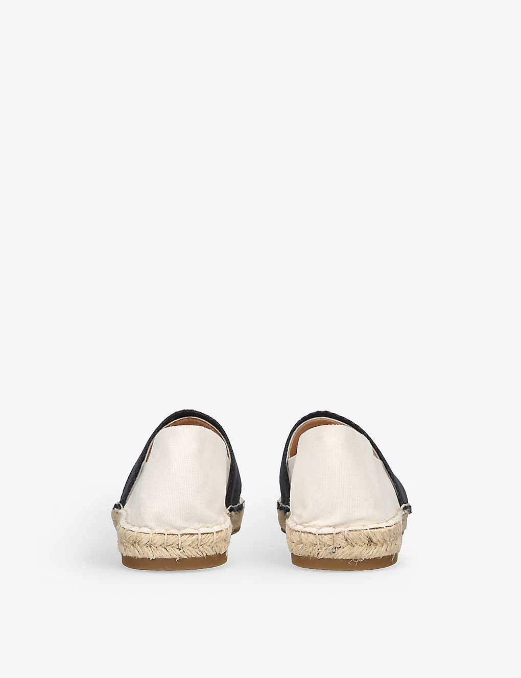 - Round toe, contrast logo print on front, woven hessian insole, exposed stitching on side, woven pattern on side of sole