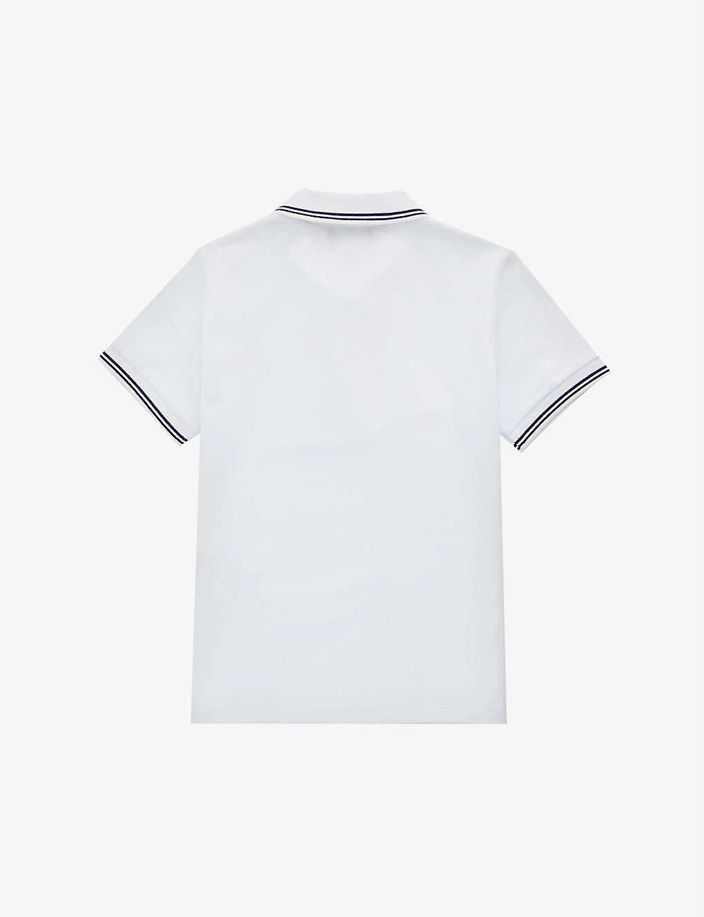 - Regular fit, collar, short sleeves, ribbed stripe trim at neck and sleeve hems, brand print at chest, branded pearlescent buttons, all-over piqué texture
