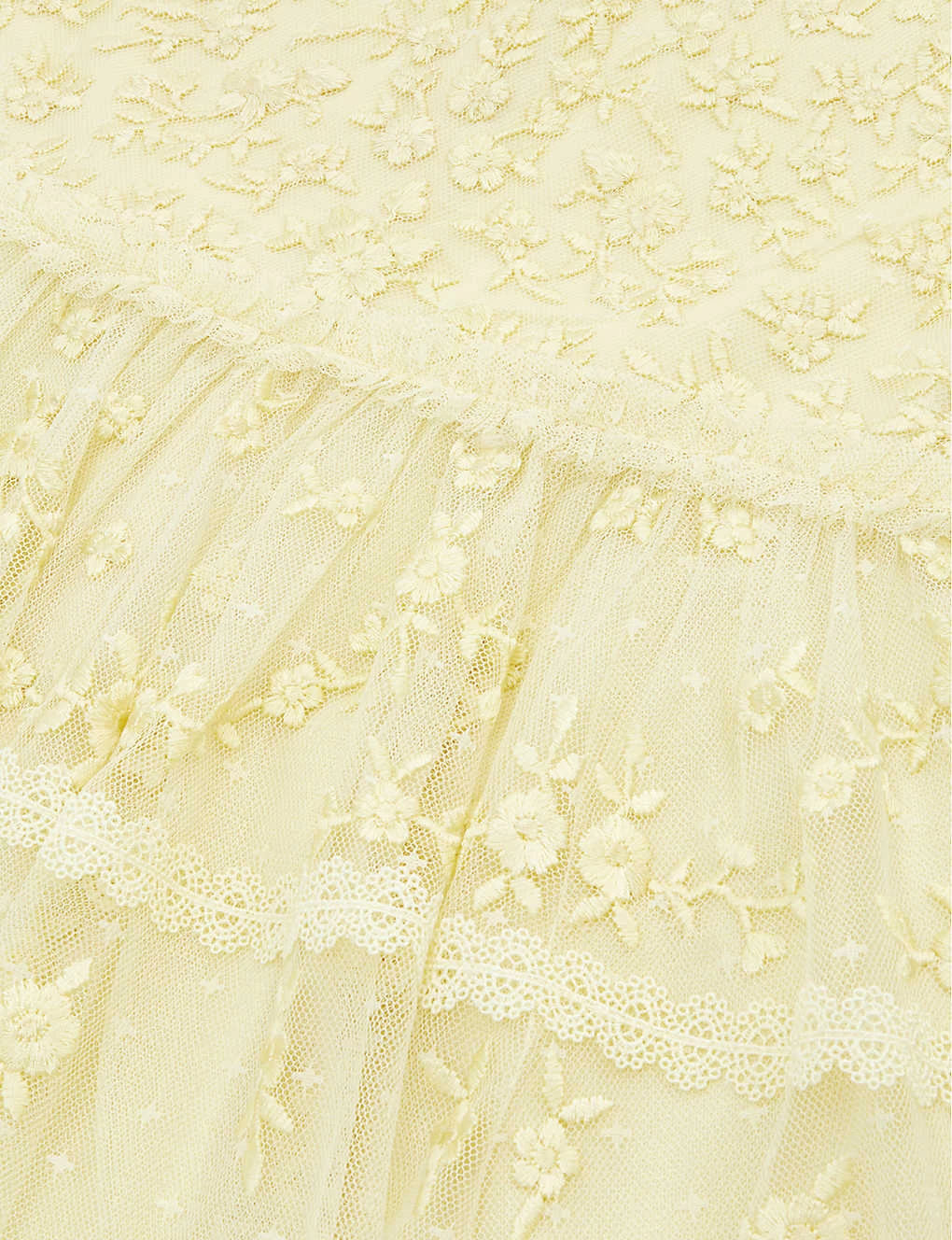 - Regular fit, round neckline, short sleeves, ruffle trim at sleeves, all-over floral embroidery, flared tiered hem, fully lined
