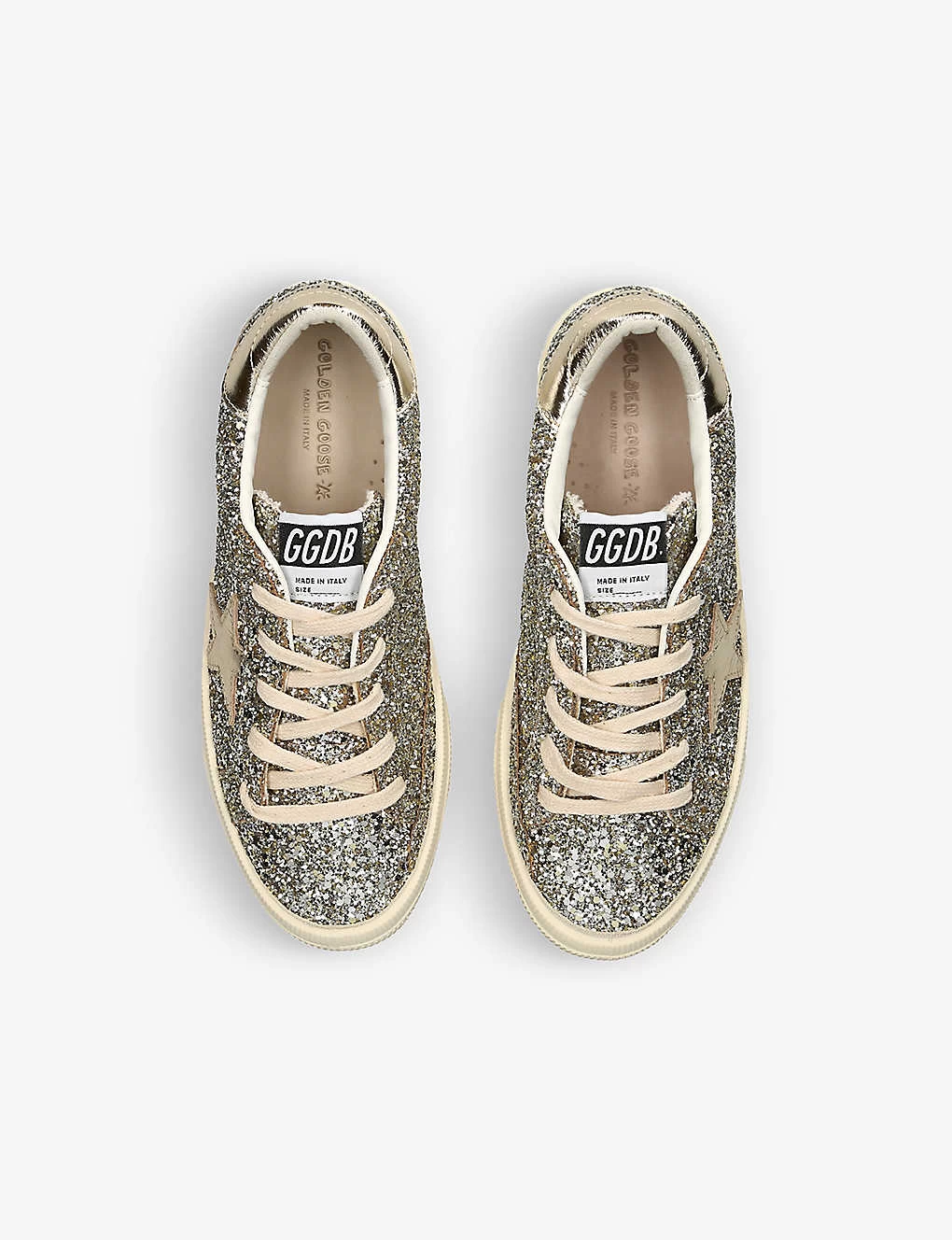 - Round closed toe, contrast panel at back heel, branded logo on tongue and sides, embellished star-motif at sides, glitter-embellishment throughout, low-top silhouette