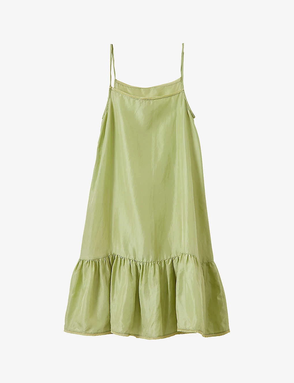 - Round neck, spaghetti straps, dropped waist, ruffled skirt