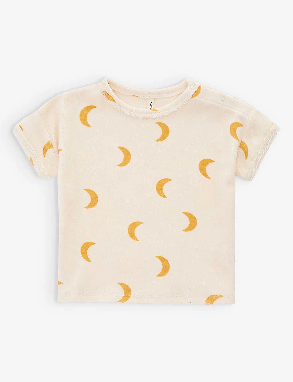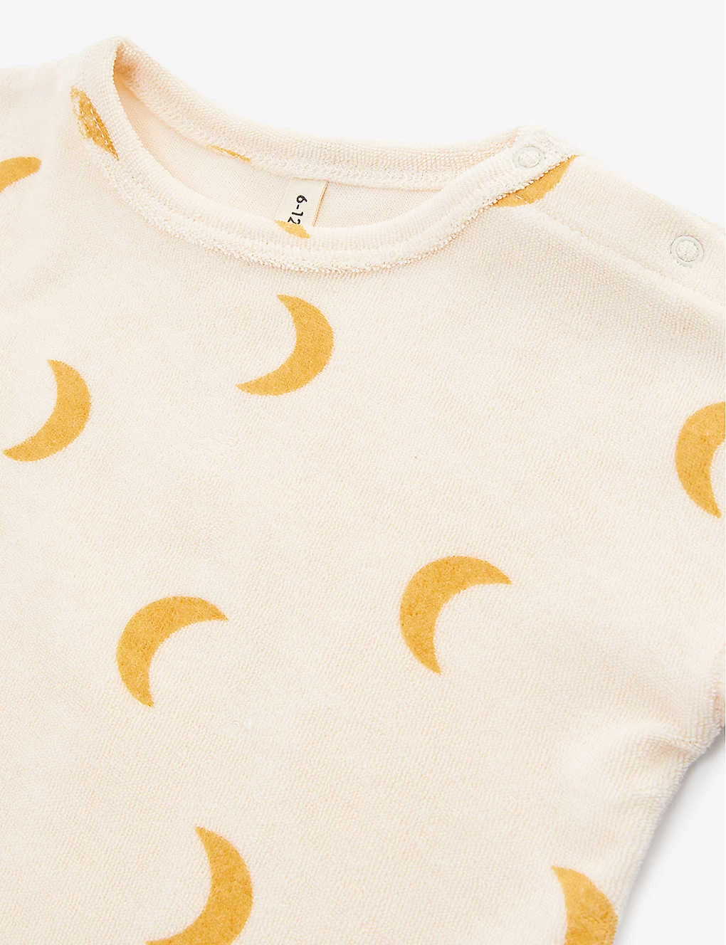 - Regular-fit, round neck, ribbed trim at neck, short sleeves, all-over moon pattern and towelling texture, embroidered brand patch at back