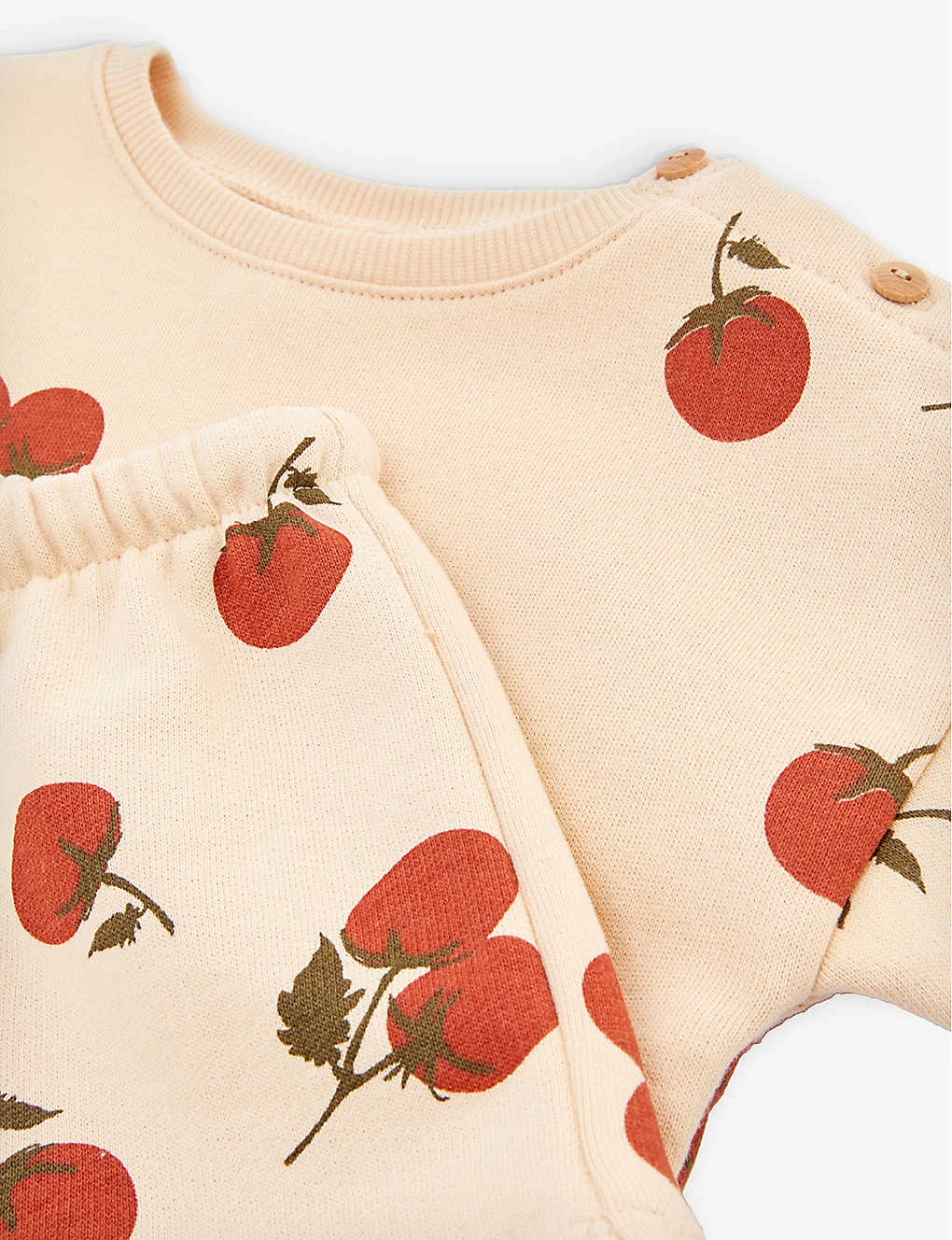 - Round neck, long sleeves, ribbed trims, all-over tomato graphic pattern, embroidered brand patch at back