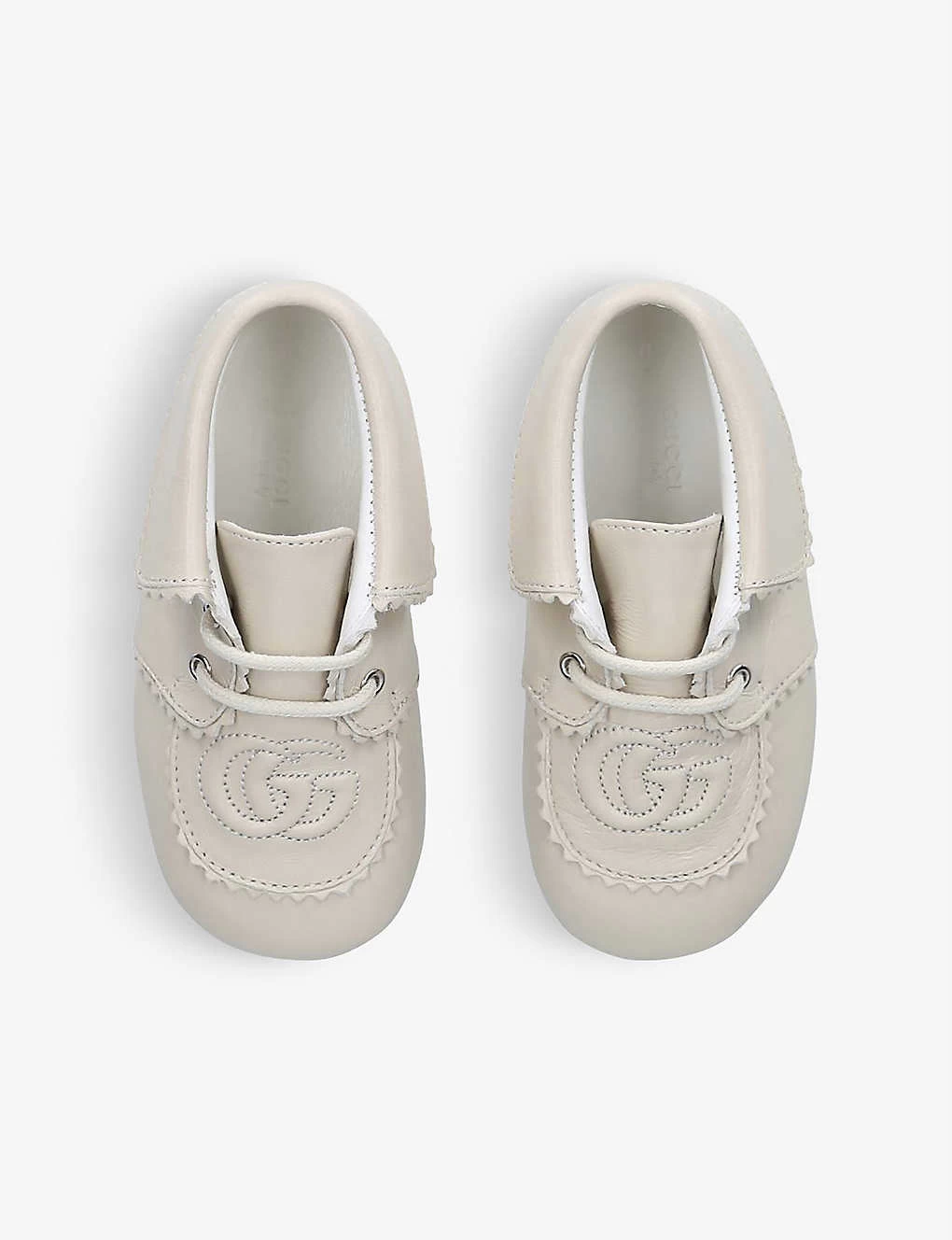 - Round toe, Double G embroidery, turned-down hem, scallop-trim, tonal stitching
