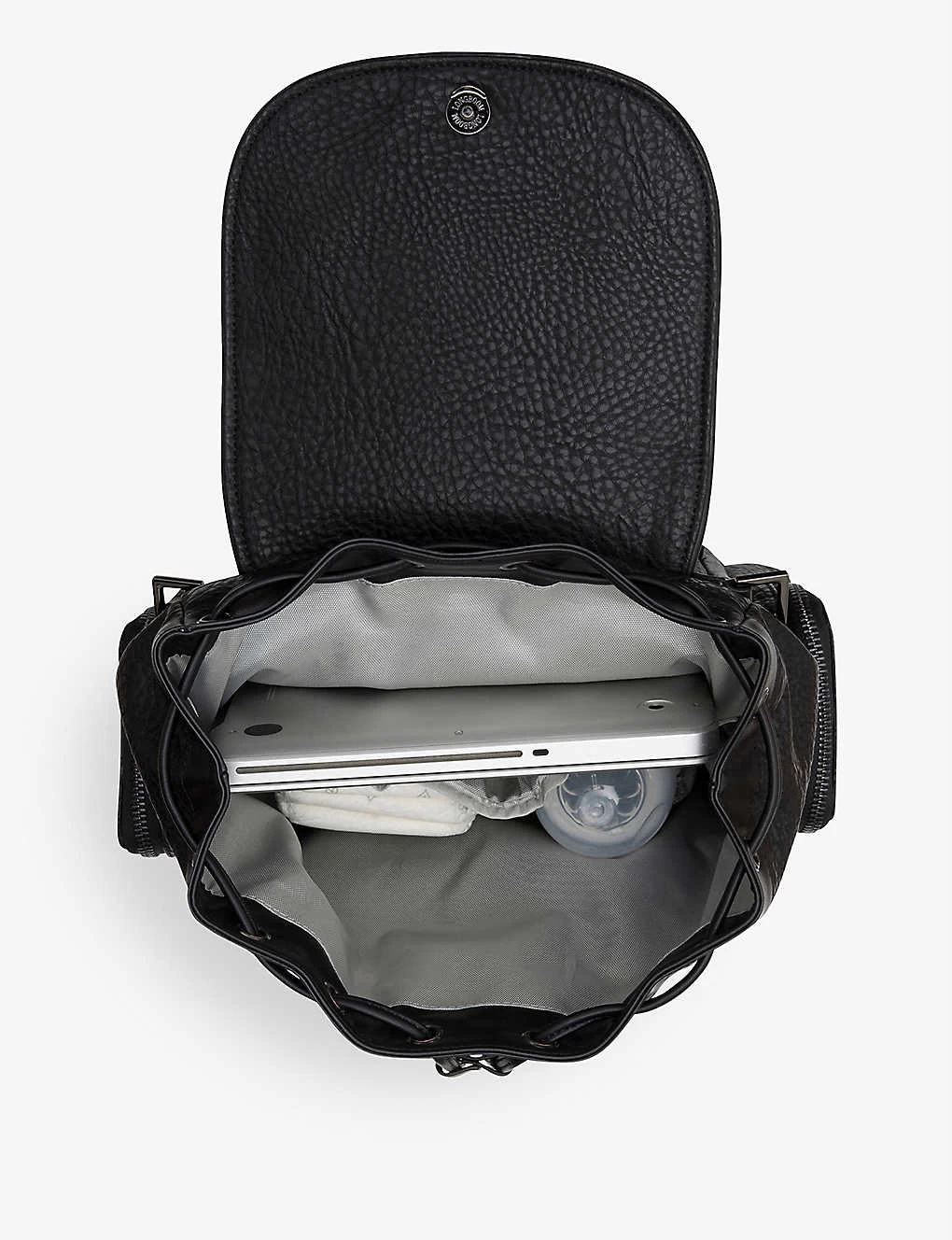 - Top handle, adjustable padded straps, two zip pockets at front, twin zip pockets at sides, two internal insulated pockets, removable clutch, includes padded changing mat, D-rings for stroller attachment