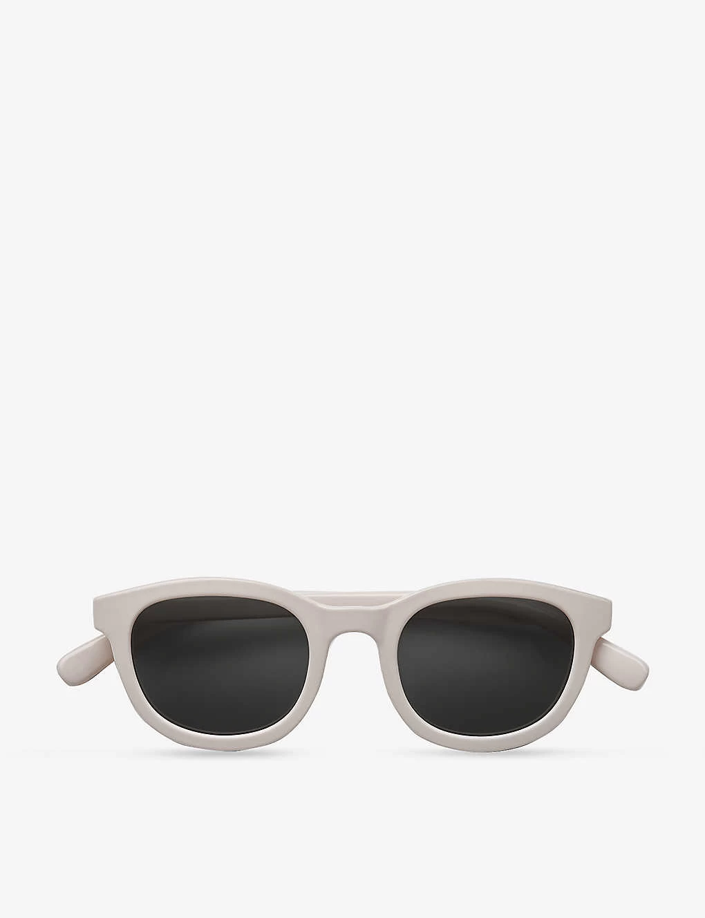 Square frame, branding at the arm, tinted lenses, silver-tone hardware