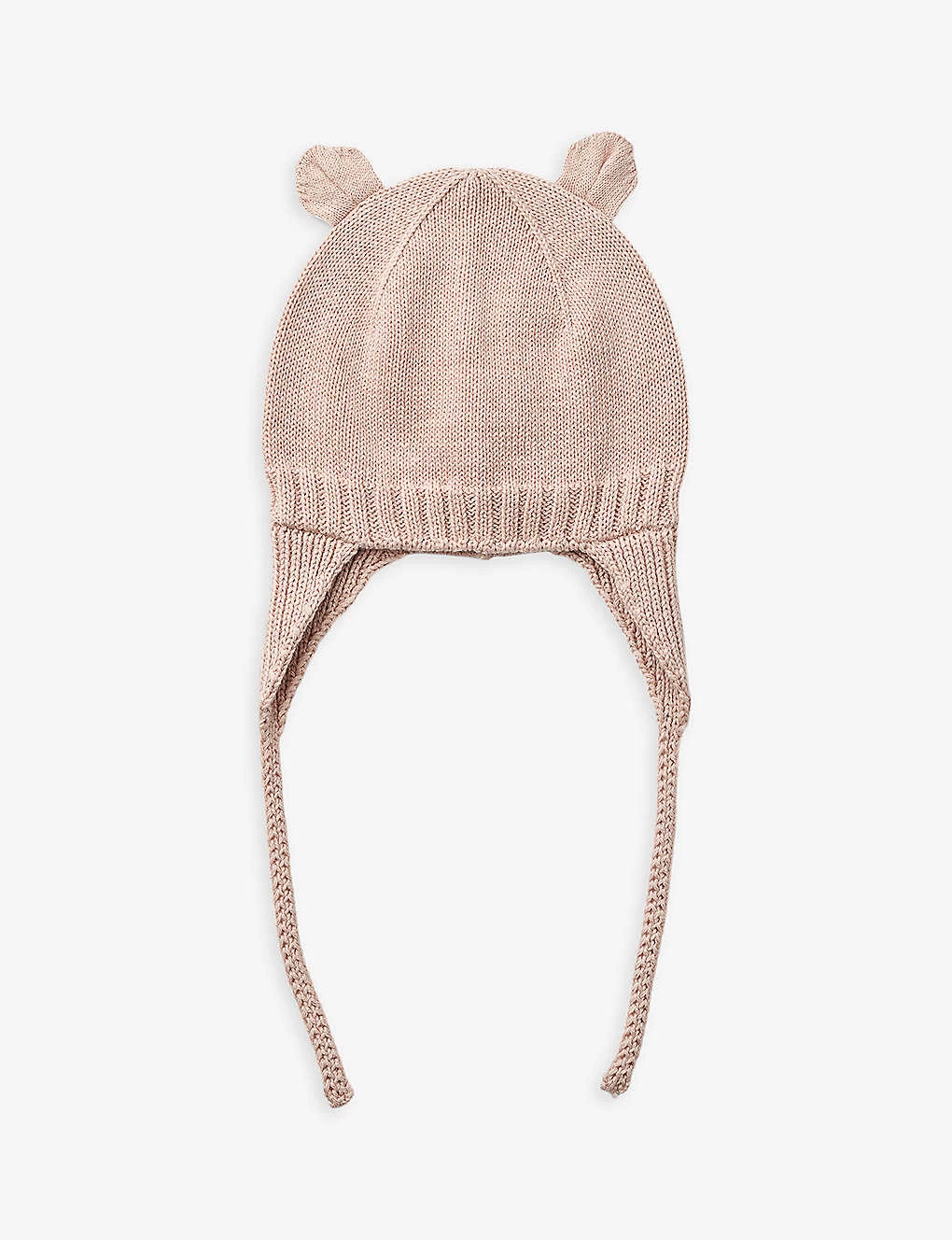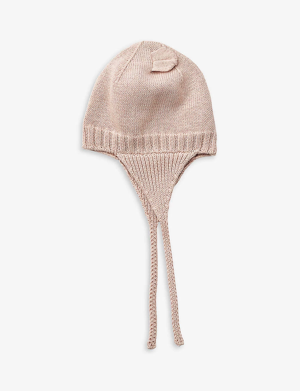 - Ears at top, all-over rib knit, self-tie fastening at neck