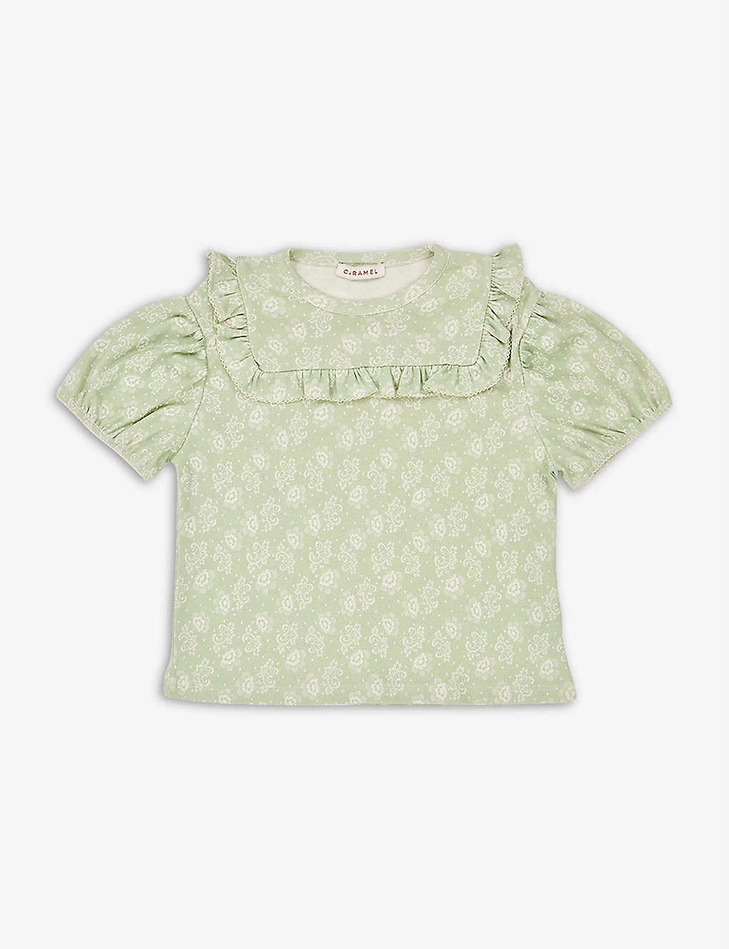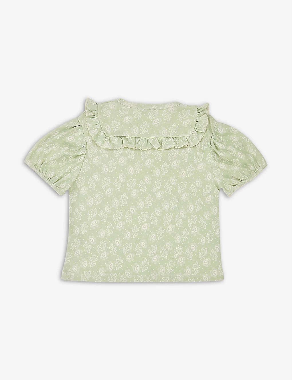 - Regular fit, floral print, round neck, frilled yoke, short puffed sleeves, contrast stitching, fully lined, straight hem