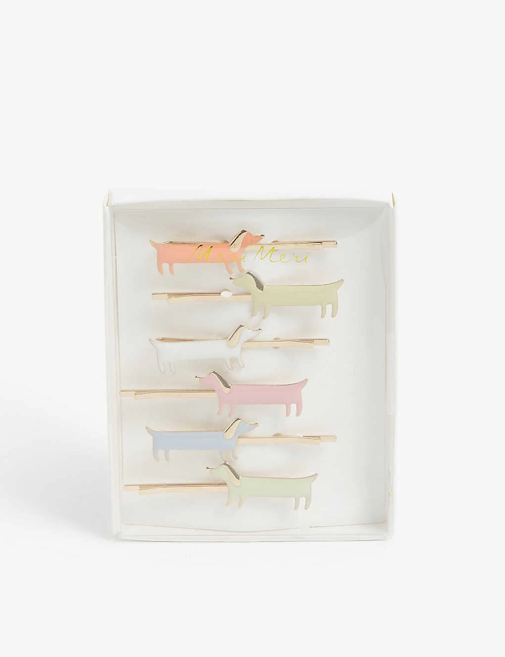 Set of six, sausage dog design, neon detailing, gold-toned hardware
