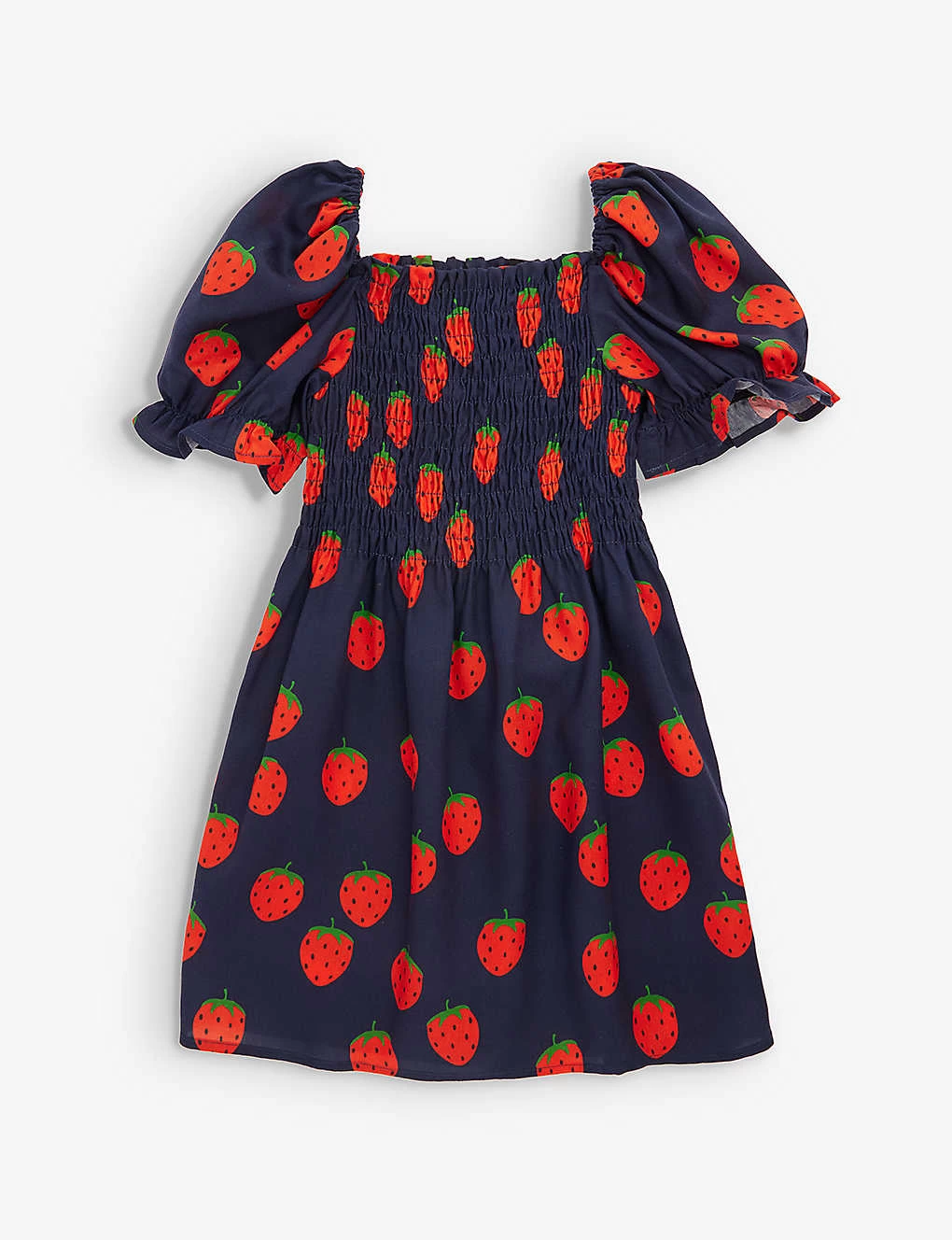 - Regular fit, square neck, puffed shoulders, short sleeves, elasticated frilled cuffs, smock panel at front and back, A-line shape skirt, all over strawberry print