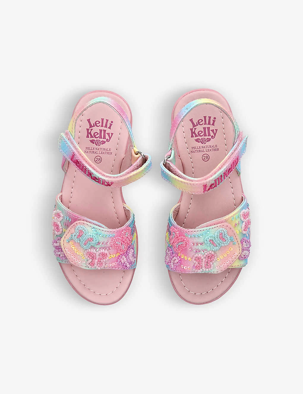 - Round open toe, adjustable straps, rainbow details, butterfly beading at upper, embossed branding at sole