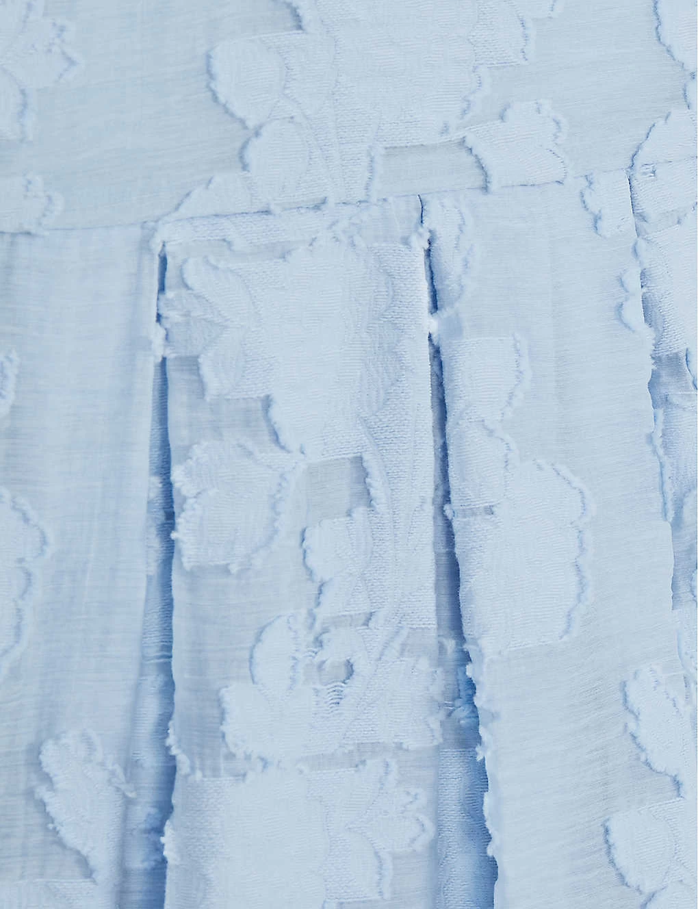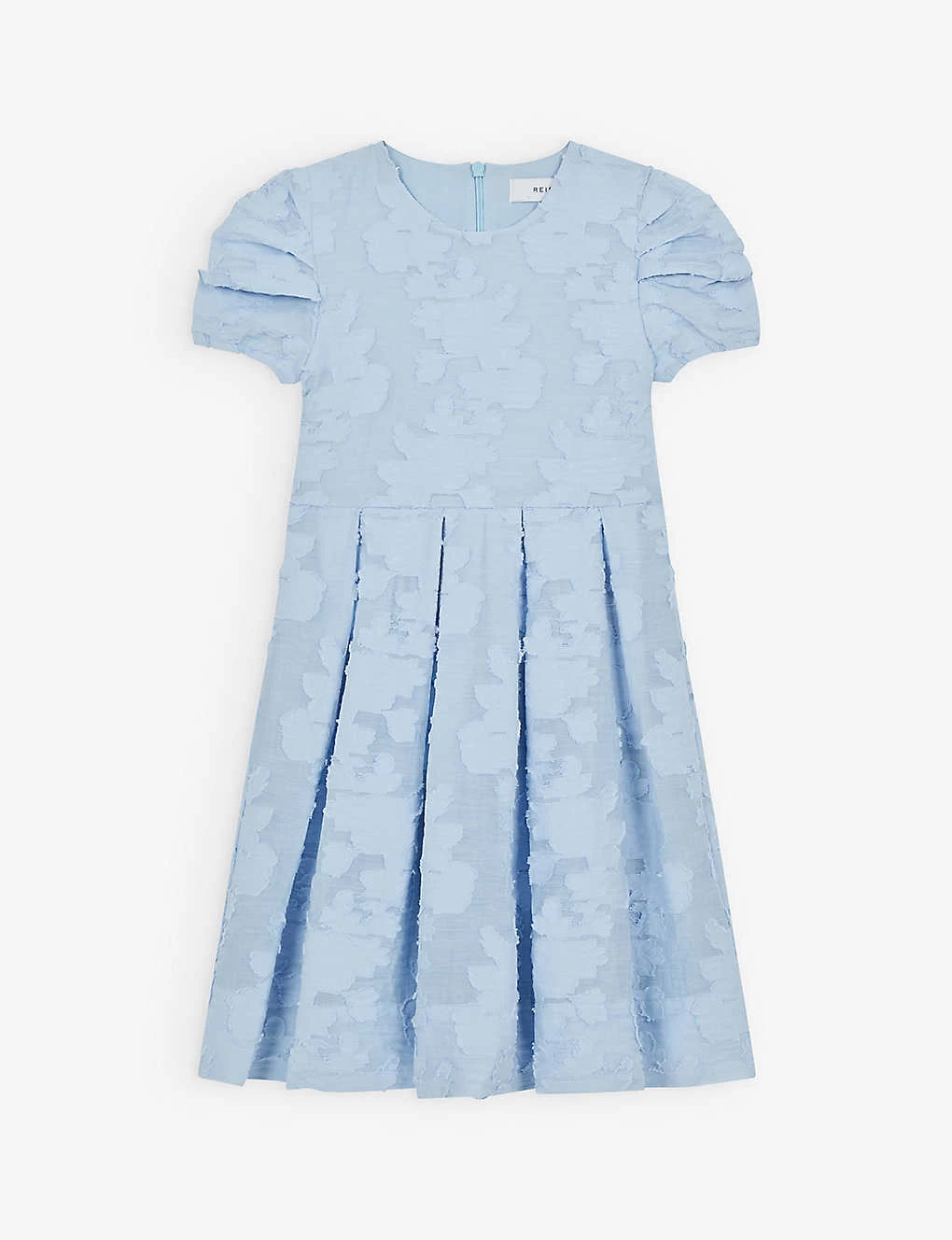 - Round neck, elasticated puff sleeves, all-over floral texture, inverted pleats at skirt, flared skirt