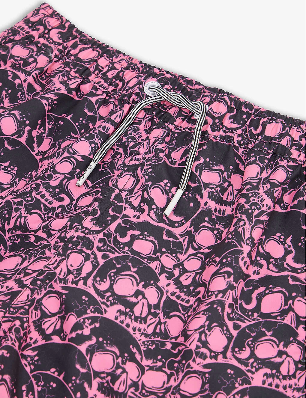 - Regular fit, mid-rise, drawstring elasticated waistband, two slip pockets at front, patch pocket at back, brand appliqué at back, all-over skull pattern, branded hardware