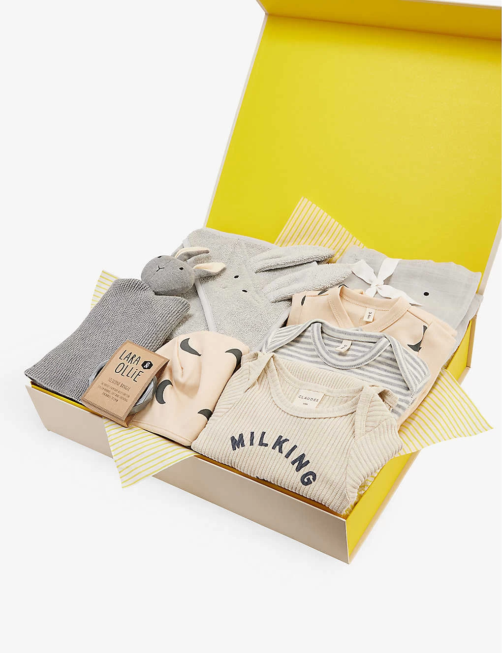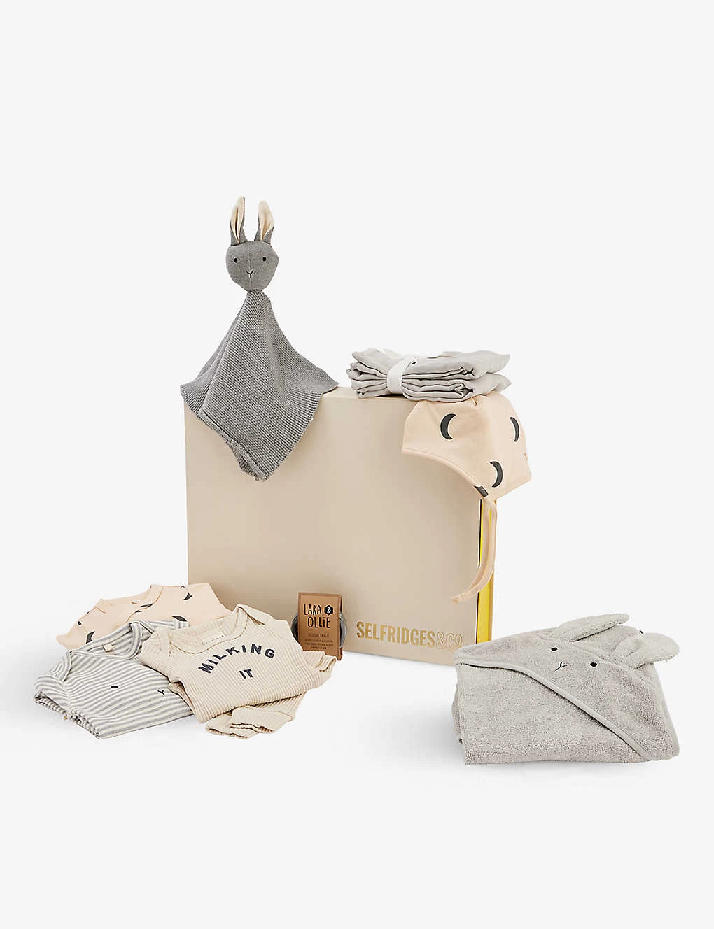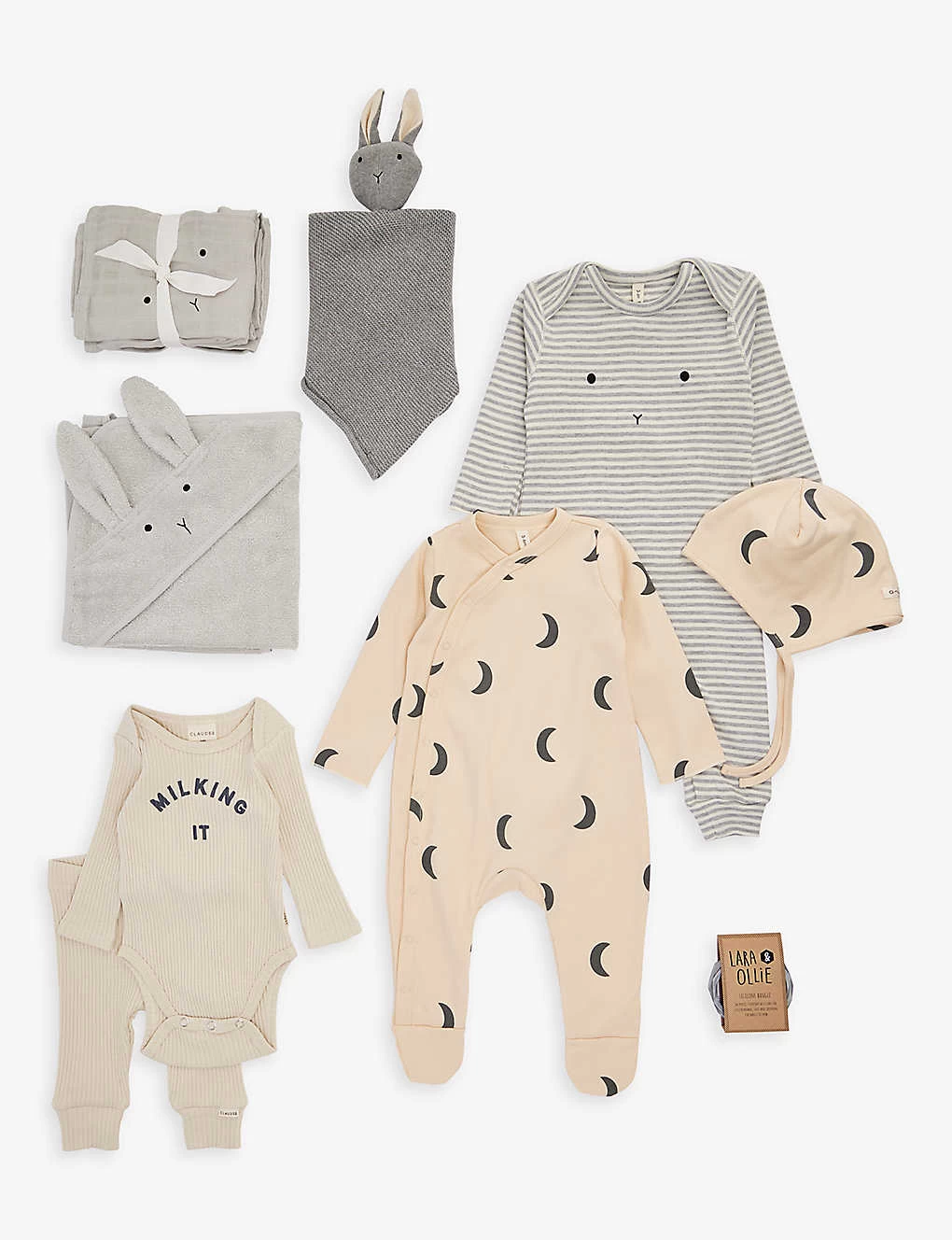 Includes: Organic Zoo Pebble Midnight organic-cotton babygrow, Organic Zoo Pebble Midnight organic-cotton bonnet, Organic Zoo organic-cotton romper, Claude & Co Milking It organic-cotton blend bodysuit, Claude & Co organic-cotton blend leggings, Liewood Bunny muslins organic cotton 68cm x 68cm, Liewood Bunny cuddle cloth 40cm x 40cm, Liewood hooded rabbit cotton towel, Lara & Ollie silicone teething bangle, gift box