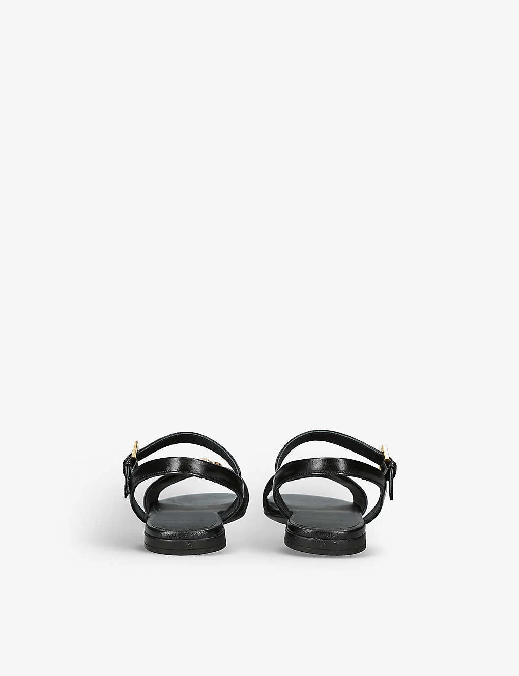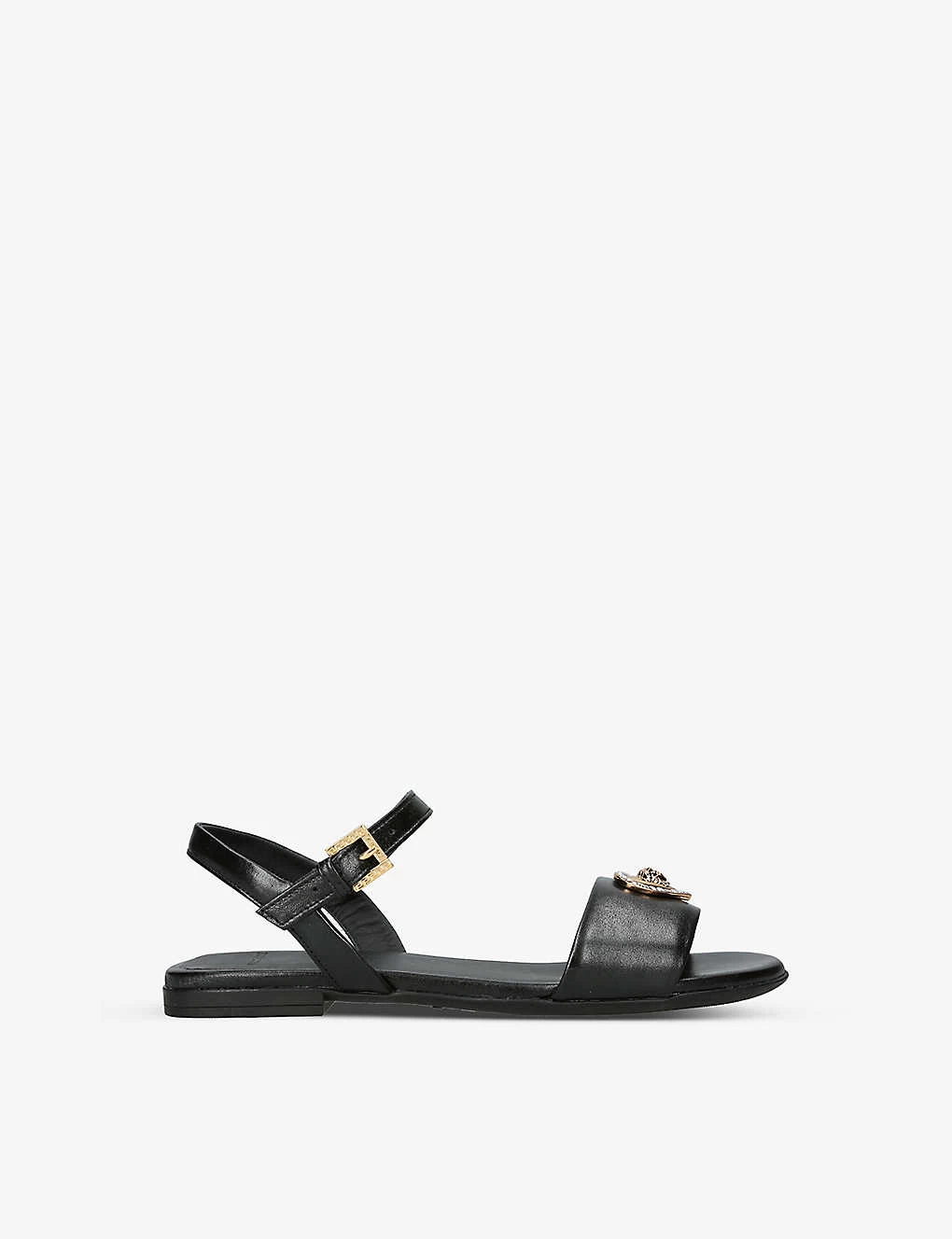 - Open toe, flat sole, ankle strap, front strap, crystal-embellished heart La Medusa plaque at front strap, branded gold-toned hardware